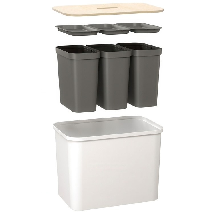 I lådan finns tre insatser för sortering av t ex metall, plast och glas.