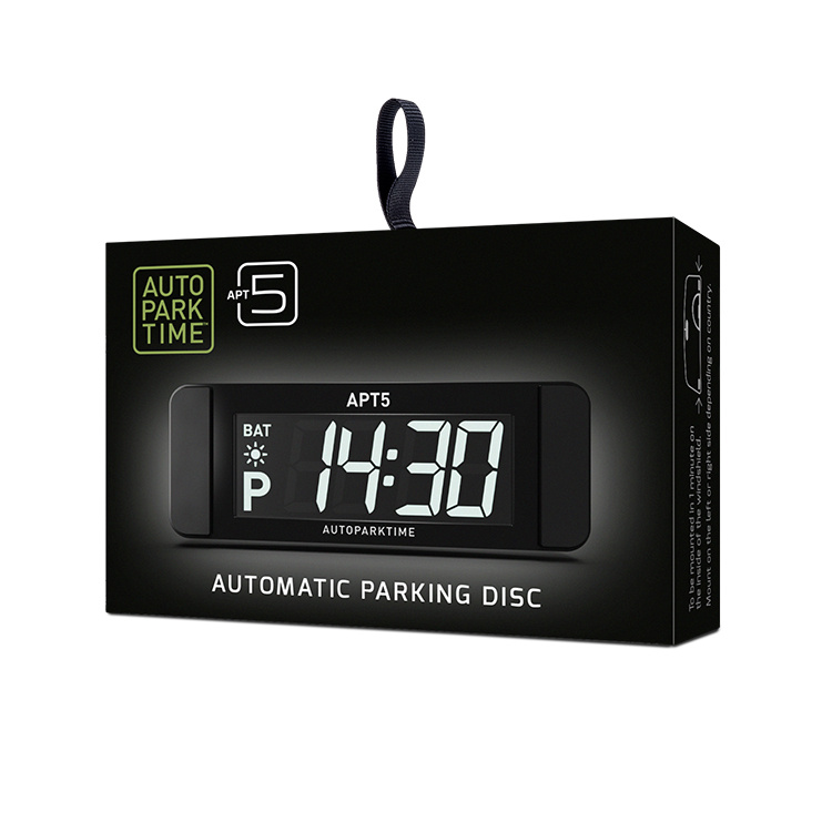 Autoparktime APT5 är en kompakt och diskret automatisk parkeringsskiva med en tydlig LCD-display som ställer in rätt tid åt dig. Den har en lång batteritid på upp till tre år och ger tydlig varning vid låg batterinivå. P-skivan justerar automatiskt mellan sommar- och vintertid och monteras snabbt på bara en minut med ett smidigt självhäftande magnetfäste.