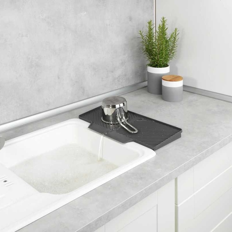 Den lutande ytan gör att vattnet rinner ner i diskhon.