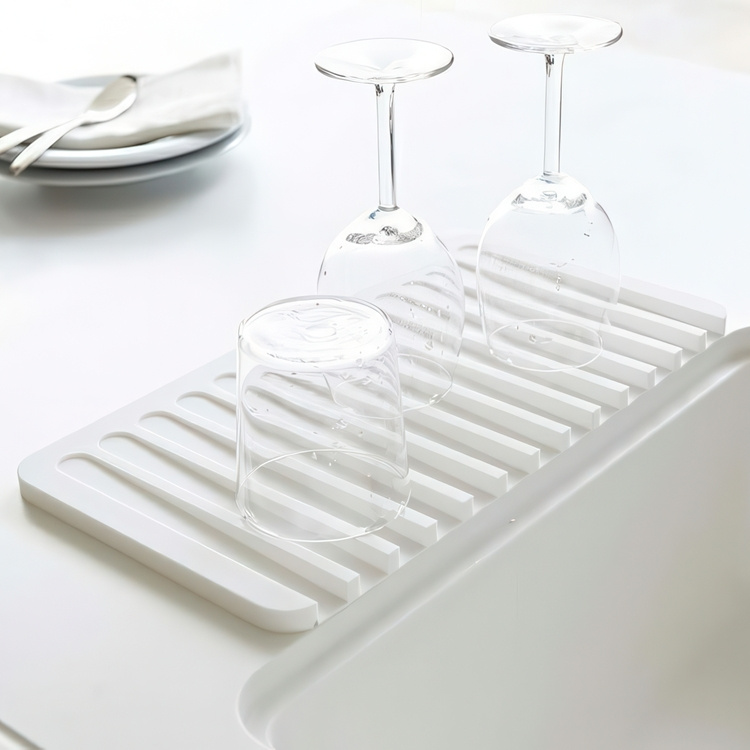 En enkel smart avrinningsbricka från Japanska Yamazaki. Ställ dina vinglas, skålar, kastruller och nappflaskor på brickan så rinner vattnet ner i diskhon och inte ut överallt på diskbänken eller samlas på brickan.