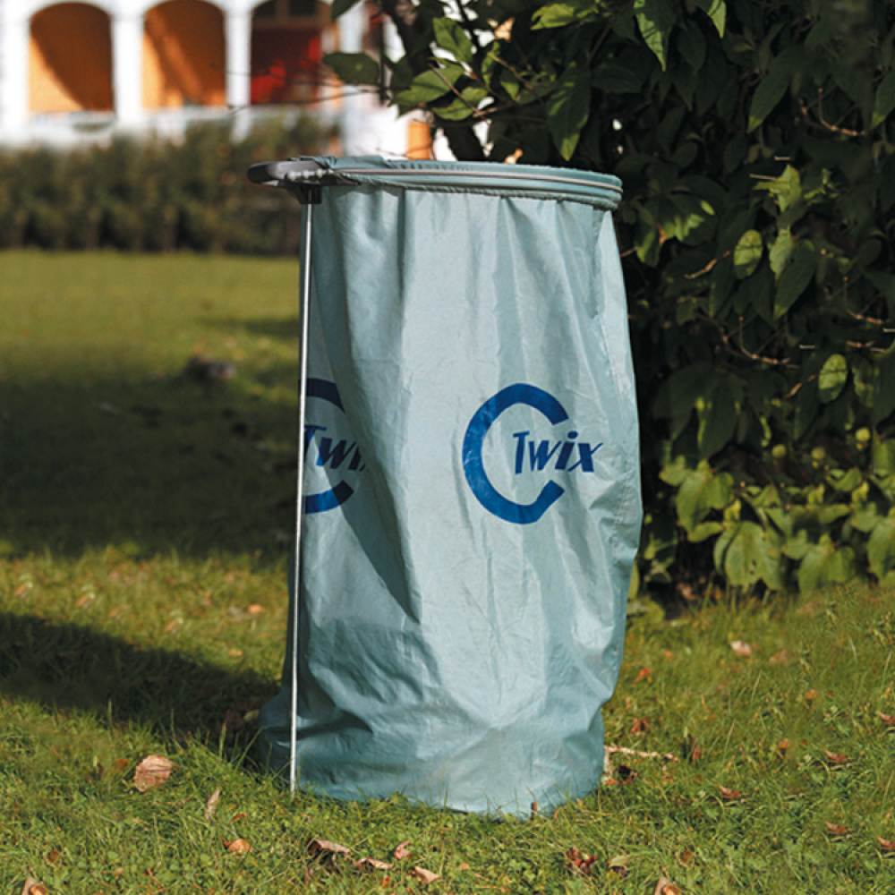 Den bärbara säckhållaren håller ut din 125 liters sopsäck och gör det enkelt att fylla den med löv och trädgårdsavfall. Säckhållaren formas och ligger platt mot marken vilket underlättar upptagningen av gräs, kvistar, löv och grenar.