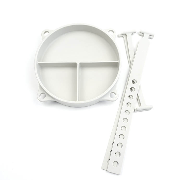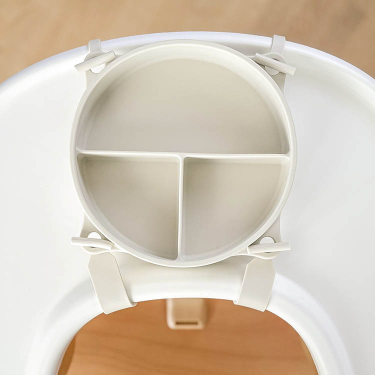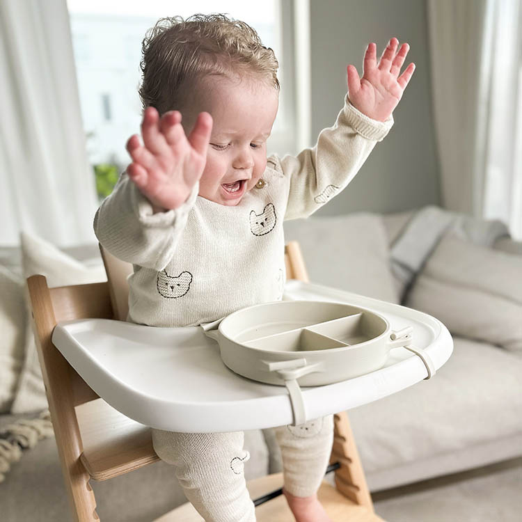 Barntallriken är utrustad med en kraftig sugpropp i botten samt fyra fästanordningar som tillsammans med de två medföljande banden ger extra stabilitet. Detta innebär att tallriken sitter stadigt fast på barnstolens bricka och inte kan lyftas bort av barnet.