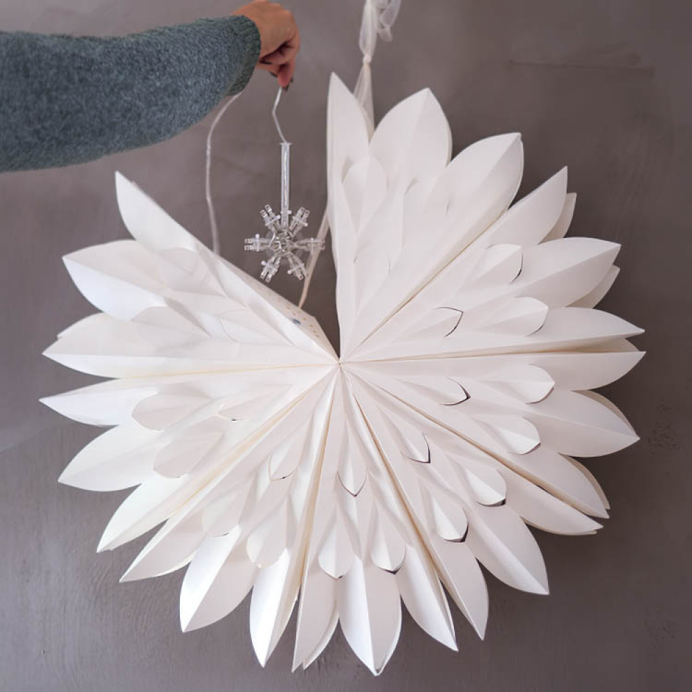 Sätt in belysningen i din julstjärna och knyt fast den på lämplig höjd med hjälp av julstjärnans egna snören. Häng sedan upp julstjärnan genom att knyta fast den med den transparenta strömsladden som går till den lilla batteridosan.