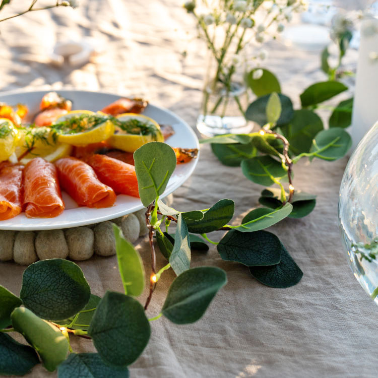 Den batteridrivna ljusslingan har eukalyptusliknande blad som gör ljusslingan lite extra festlig att hänga upp, slingra runt arbetsplatsen eller pynta bordet med. De små LED-dioderna sitter utspridda längs hela slingan och när du tänder ljuset lyser de med ett varmvitt sken genom bladverket.