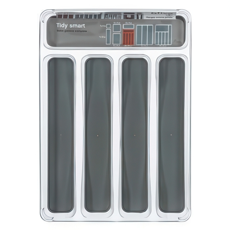 Fem separata besticksfack möjliggör tydlig separat sortering av knivar, gafflar, skedar, teskedar, köksknivar eller pennor och gem.
