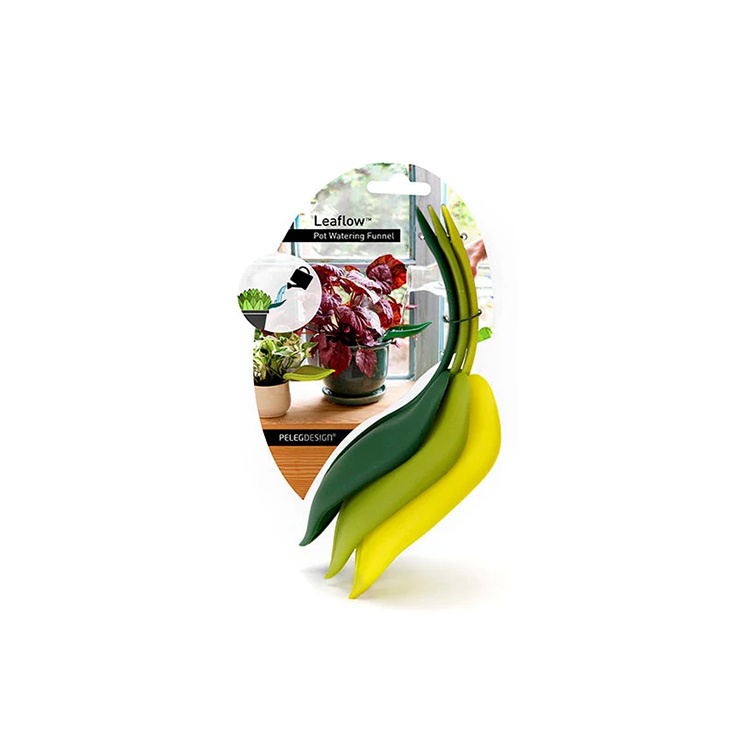 Trattens form ser ut som ett löv, vilket gör att den smälter in på ett naturligt sätt bland växtens blad. Den diskreta designen gör att du kan låta tratten sitta kvar i krukan hela tiden utan att det stör helhetsintrycket. Och eftersom tratten sitter direkt i jorden, är den alltid på plats när det är dags att vattna.Tre färger i ett paket