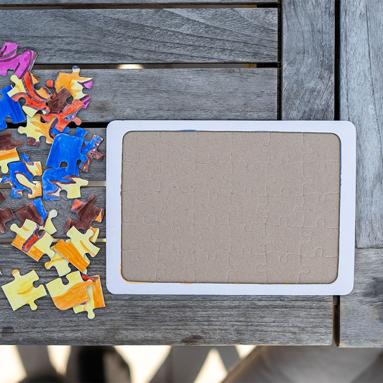 På de blanka pusselbitarna kan ni rita direkt, skissa med blyerts, eller klippa till en schablon som ni sedan kan färglägga pusslet efter. Det går att färglägga de hårda pappbitarna på många sätt, så låt kreativiteten flöda och använd pusslet som en blank canvas full av möjligheter. När pusslet sedan är klart blir det extra kul att försöka få ihop den egenmålade bilden.