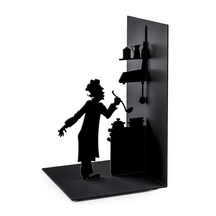 Ett roligt och dekorativt bokstöd i metall i form av en siluett av en kock.