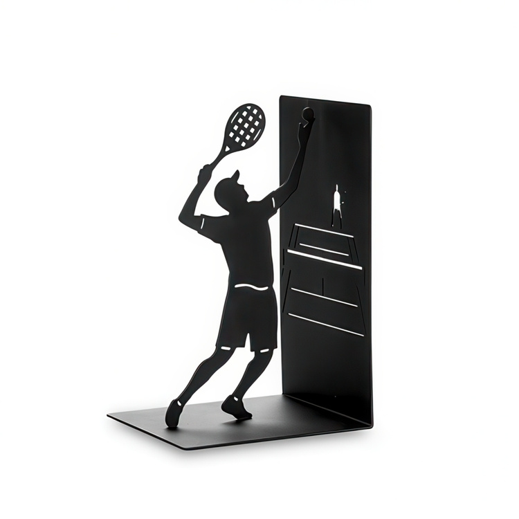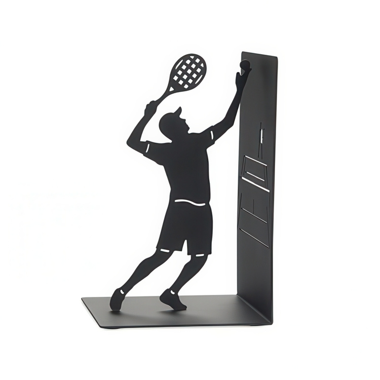 Ett roligt och dekorativt bokstöd i metall i form av en siluett av en tennisspelare.