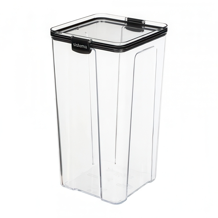 Extra klar, stor, stapelbar, greppvänlig, hög och lufttät fyrkantig burk.