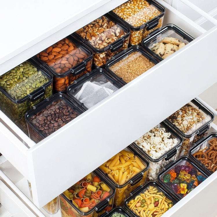 Extra klara, stapelbara och lufttäta fyrkantiga burkar.