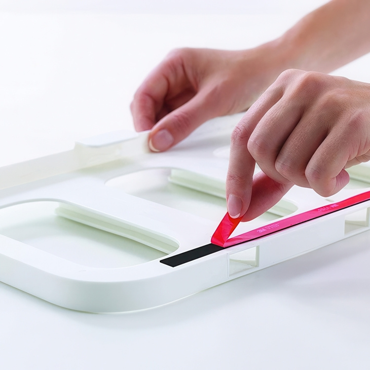 Enkel installation! Häng upp skenan på hyllkanten och fäst den baktill med den medföljande självhäftande tejpen. Hyllkanten får max vara 2 cm tjock.