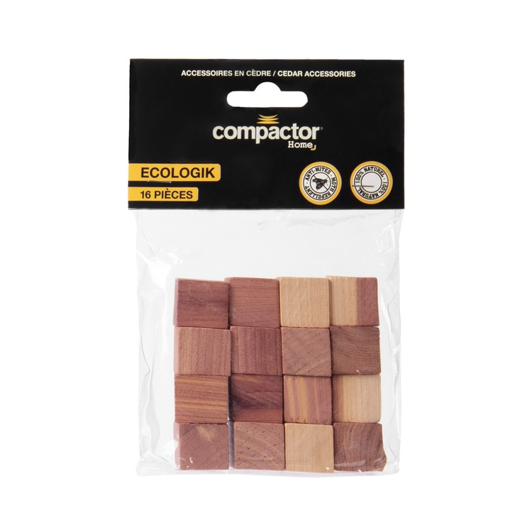 En förpackning med 16 stycken doftblock av cederträ i form av små kuber.