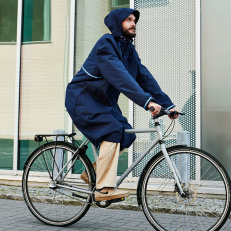 Den rymliga oversizepassformen gör jackan lätt att bära över lager året runt. Den hjälmanpassade huvan ger bra sikt i trafiken, och diskreta reflexdetaljer ökar synligheten i mörker. En integrerad benrem håller jackan på plats i blåst och ger extra skydd över knäna.Storleksguide