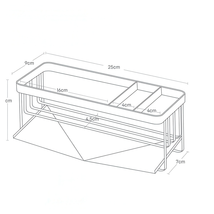 Tack vare den sluttande metallskivan i botten kan vattnet rinna direkt tillbaka i diskhon och svampar och flaskor förblir torra och rena. -