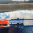 Knyt fast återhämtningslinan i draghajen, lägg draghajen över den spända fiskelinan och släpp ner draghajen i vattnet. Håll fiskelinan spänd tills draghajen följt fiskelinan hela vägen ner till fiskedraget. Det inre spåret i draghajen guidar den rätt längs med fiskelinan.