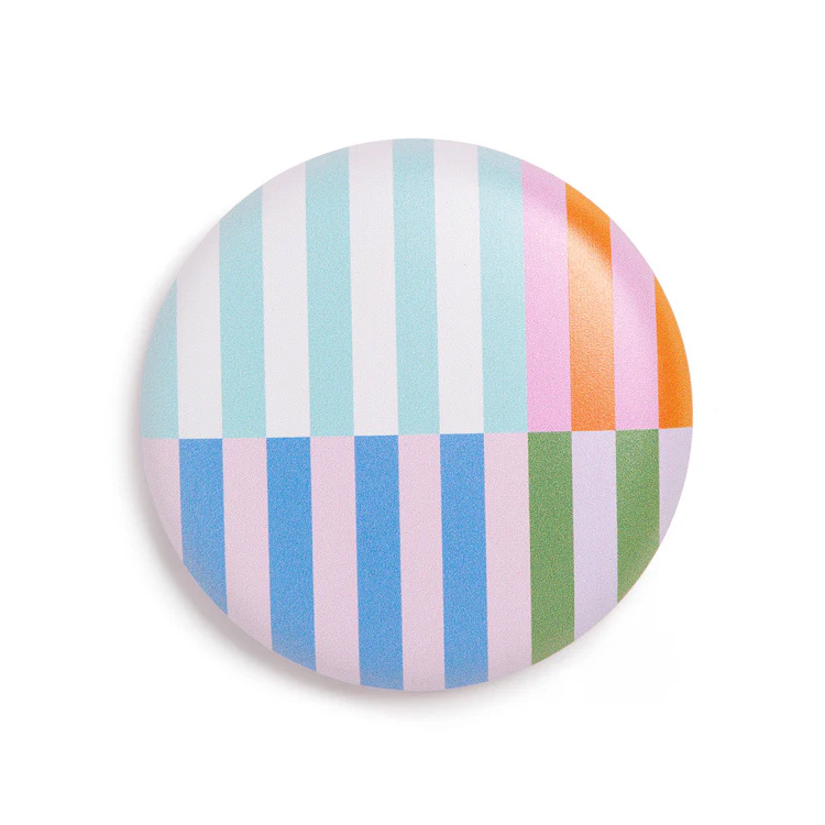 Fickspegeln har en diameter på 9 cm och är endast 1,5 cm hög, vilket gör att den enkelt får plats i handväskan, necessären eller resväskan. Den finns i två färgglada varianter som levereras osorterade.Specifikationer