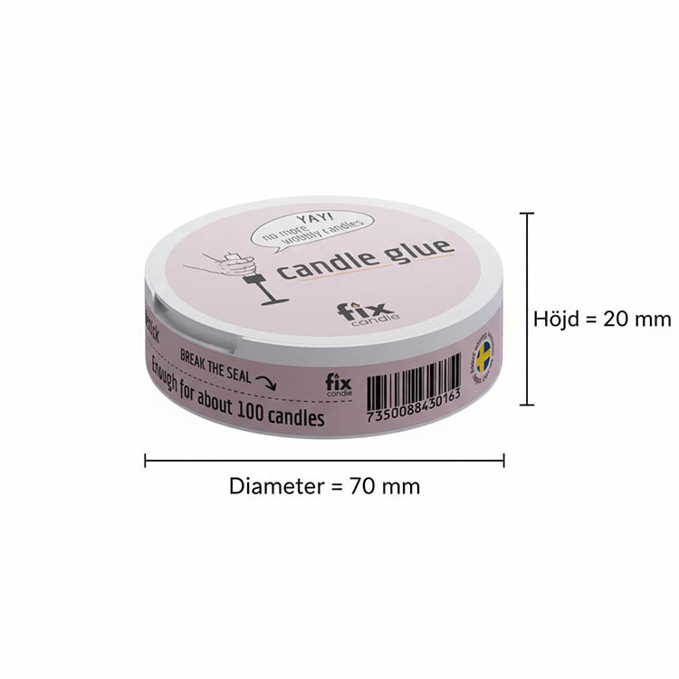 Applicera en ärtstor mängd under ljusets bas, tryck fast och vrid lätt. Det ger ett stabilt grepp som minskar risken för att ljuset lutar eller välter. En behållare räcker till över 100 ljus, vilket gör den användbar under lång tid.Fäster på flera material