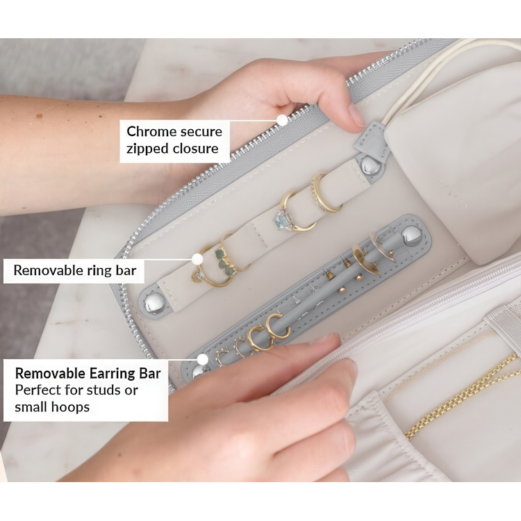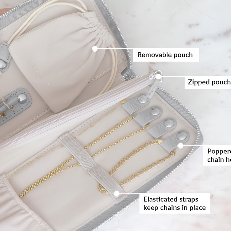 Det här fina och kompakta smyckefodralet med blixtlås har gott om plats för att förvara alla dina favoritsmycken. Lätt att ta med i handväska eller i ditt bagage. Perfekt för smyckesförvaring hemma eller på språng. -