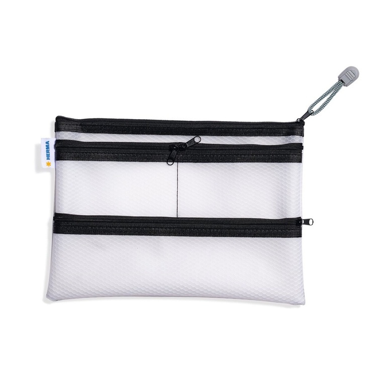 Ett praktiskt fodral med fyra fack som stängs med dragkedja. Ett stort fack och tre små.