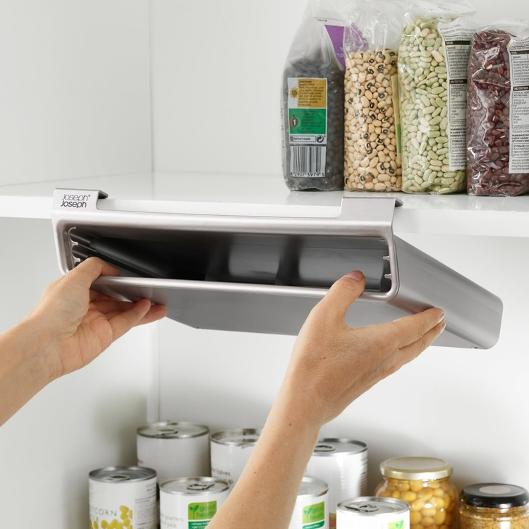 Ett praktiskt ställ i metall för skärbrädor som du fäster under en hylla.