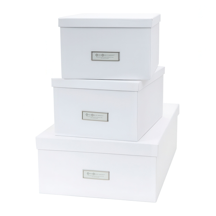 Förvaringsboxar INGE från Bigso. Tre stycken snygga och praktisk förvaringsboxar. En stor och två mindre. Passar för papper och små saker i kontoret eller för kläder i garderoben. Stapelbara med plats för etikett. -
