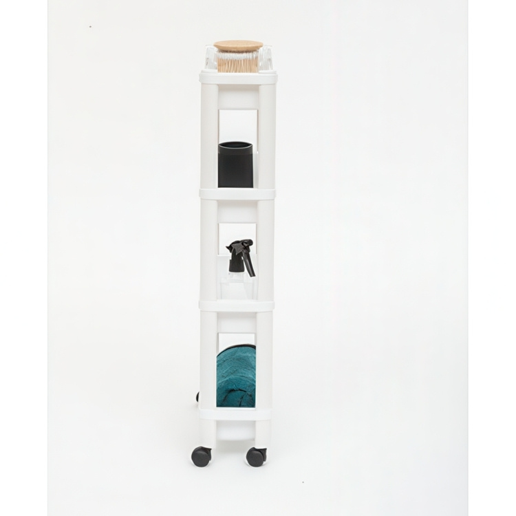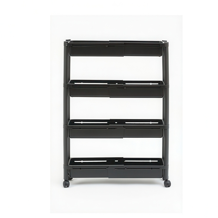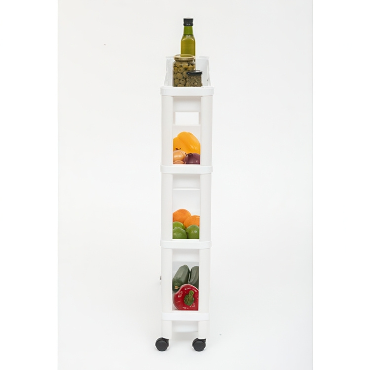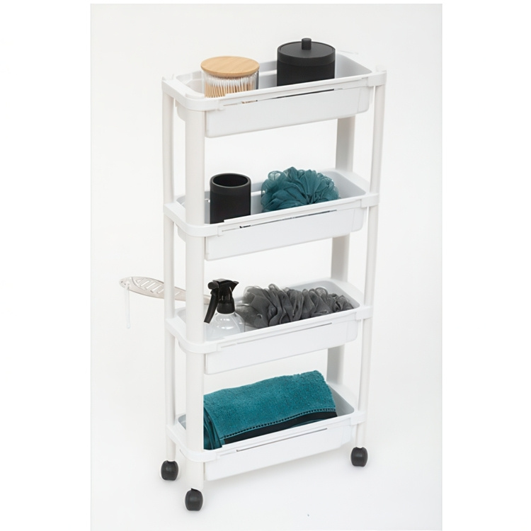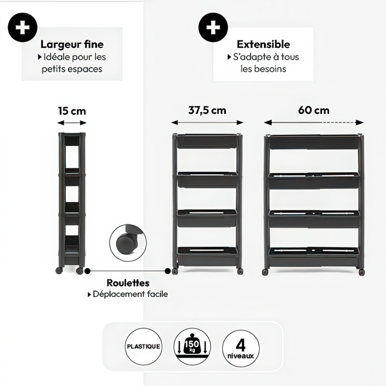 Smal förvaringsvagn i kraftig plast med fyra korgar. Expanderbar från 37,5 cm till 60 cm.