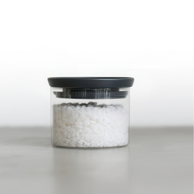 En snygg stapelbar, rund glasburk för förvaring av torra livsmedel.