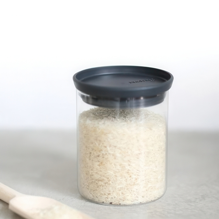 En snygg stapelbar, rund glasburk för förvaring av torra livsmedel.