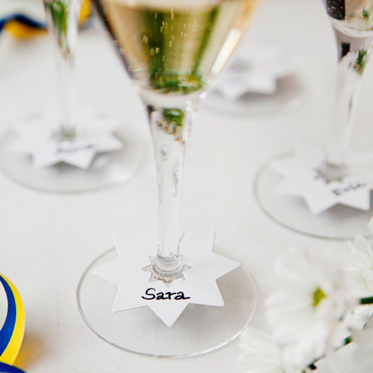Glasmarkören MingleID är lösningen på problemet med förväxlade glas. För visst är det lätt att man sätter ifrån sig sitt glas och sedan förväxlar det med någon annans. På glasmarkören kan du skriva gästernas namn, blir fint även som placeringskort.