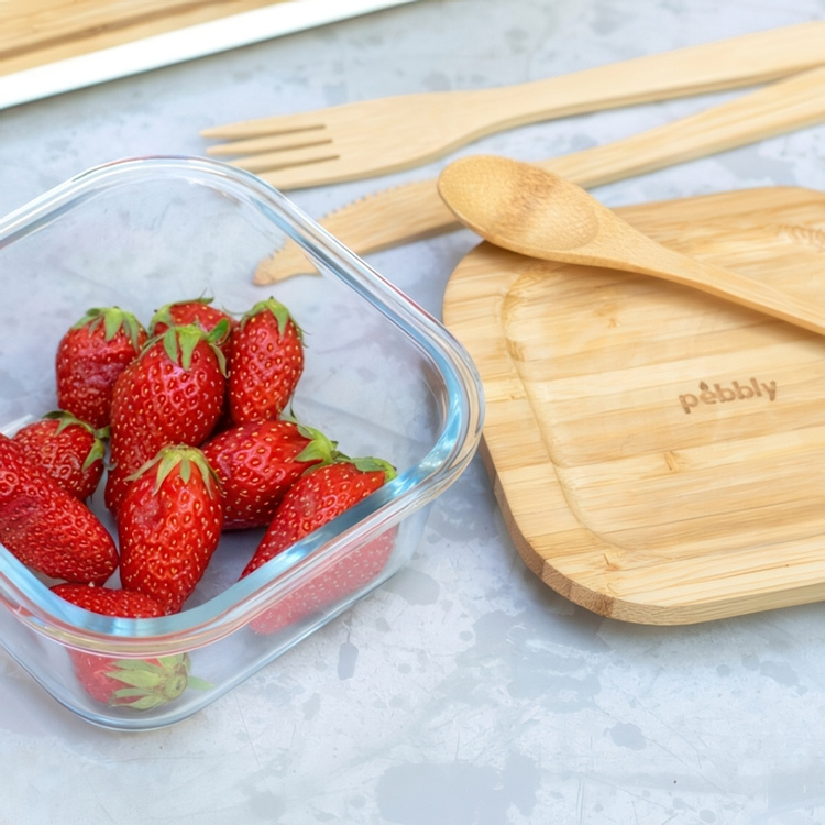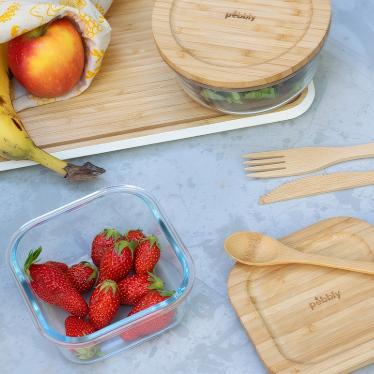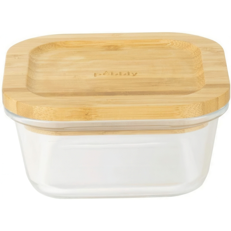 Snygg och praktisk liten matlåda i glas med lufttätt lock i bambu. Ffrån Franska Pebbly. Miljövänlig.