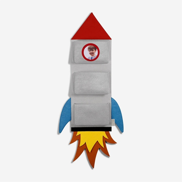 På Rocket Wall Pocket finns ett fönster där du kan sätta in en bild på ditt barn. Då ser det ut som om någon sitter i raketen.