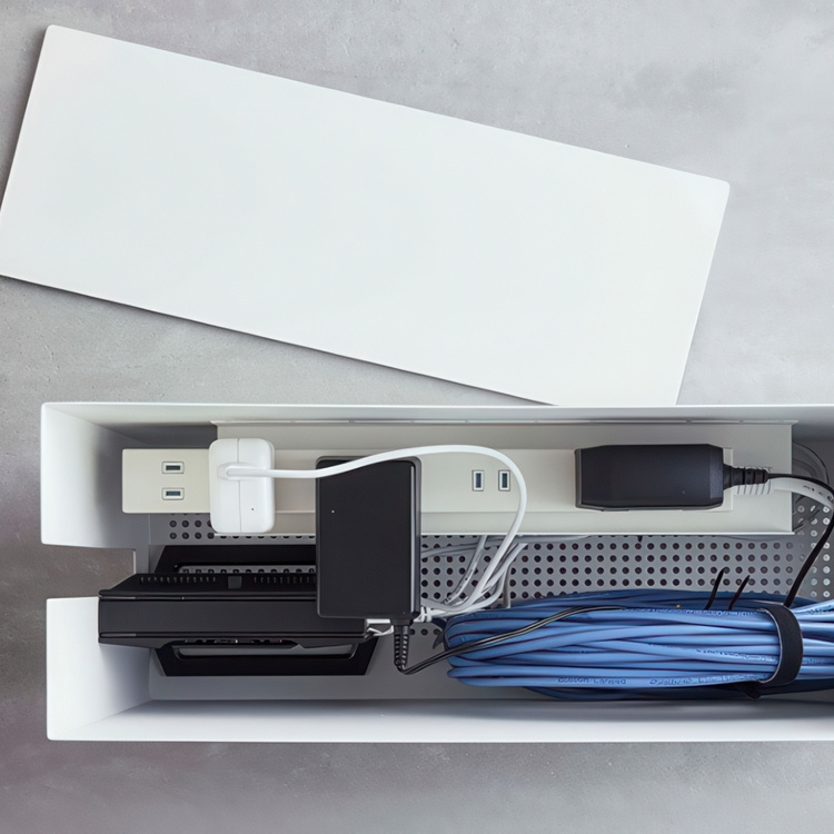En stor kabellåda i metall med plats för kablar, grenuttag, modem och mer.