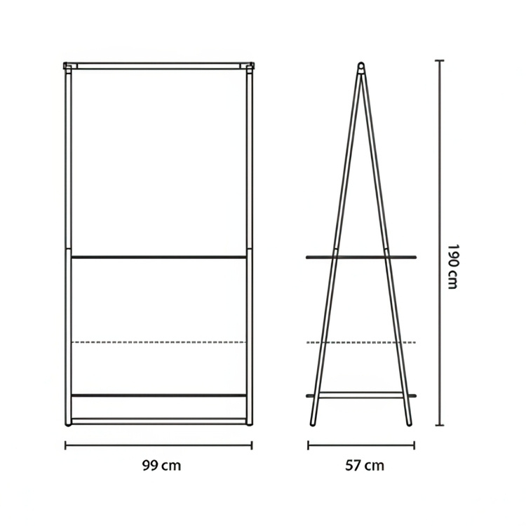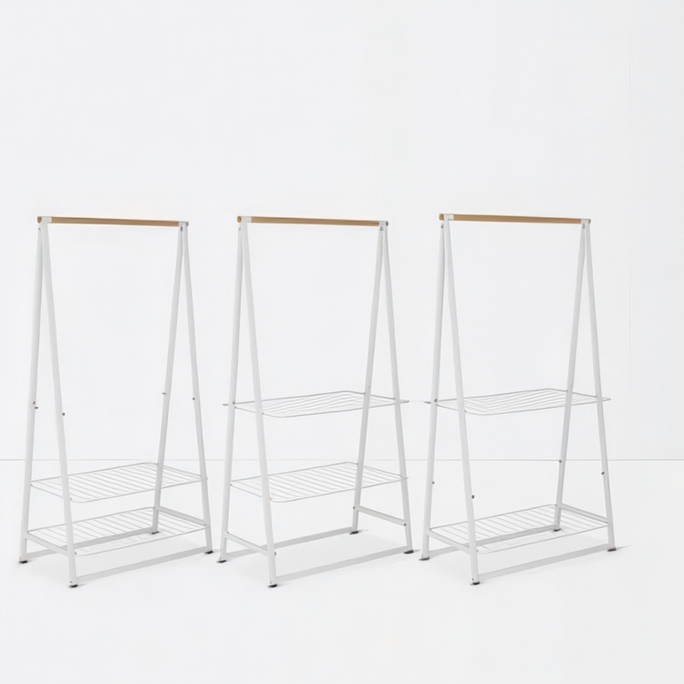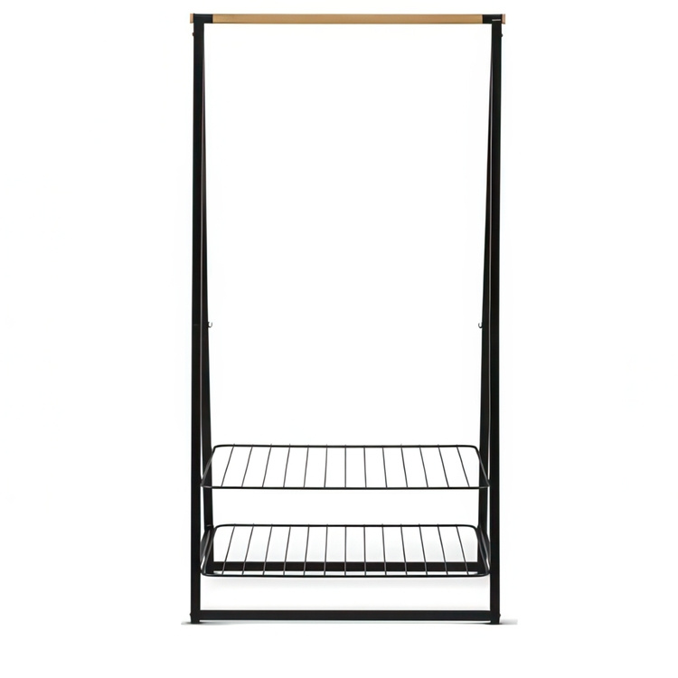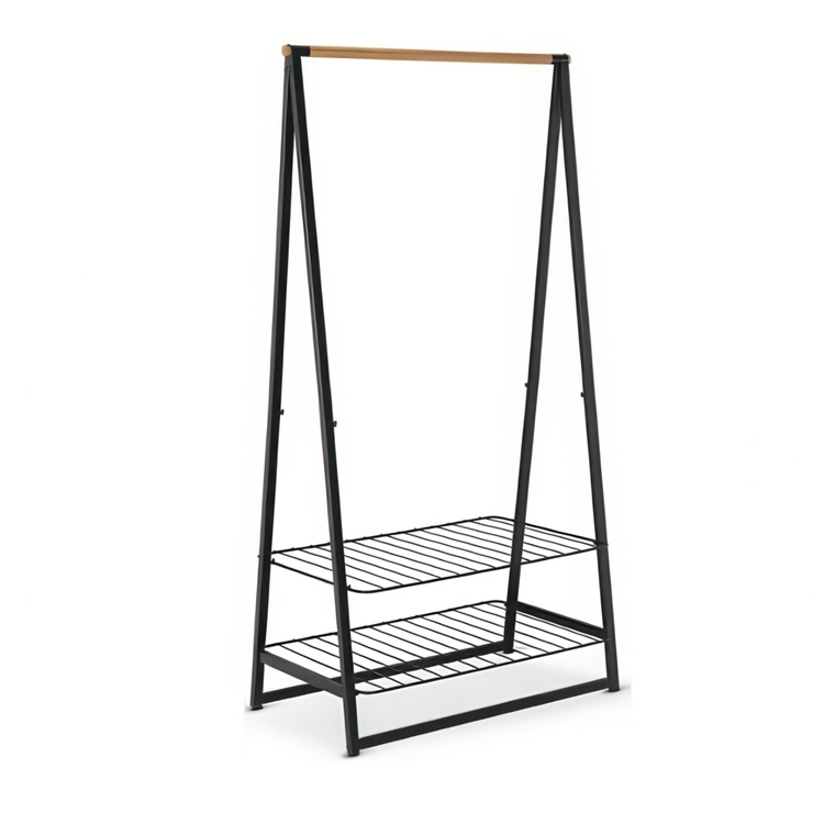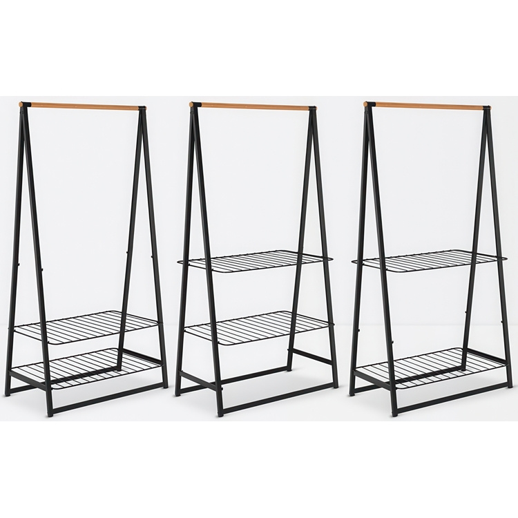 En fristående klädställning i metall med en klädstång i bambu och två justerbara hyllor.