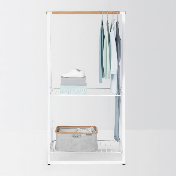 Häng dina kläder på galgar på den robusta bambustången och använd hyllorna för att förvara t ex tröjor eller skor.