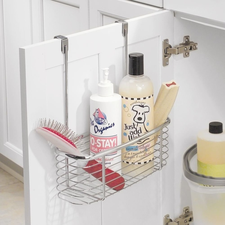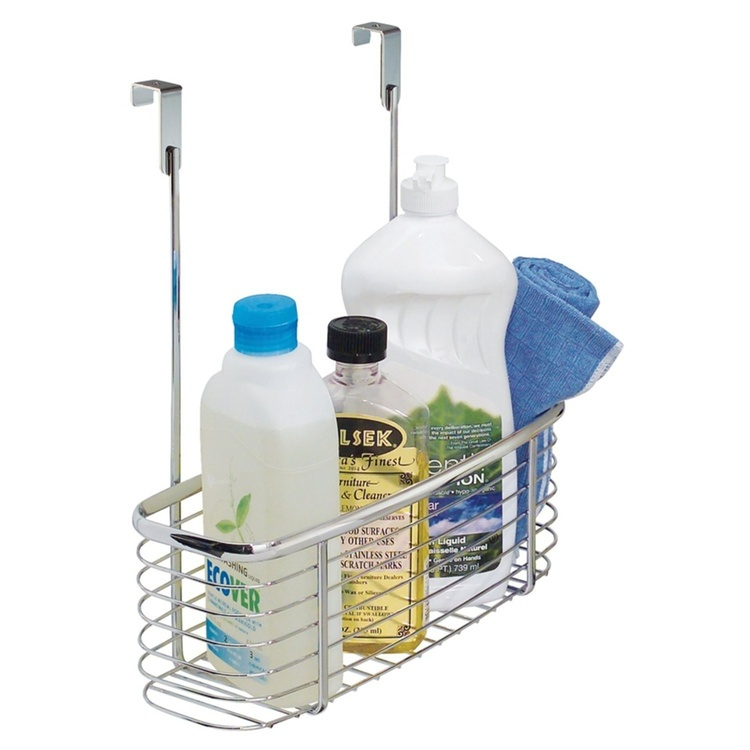 Utnyttja skåpdörren i köket, badrummet eller tvättstugan. Förvaringskorg i polerat kromat stål hänges enkelt över skåpdörren. Ger god plats åt förpackningar som t.ex. diskmedel, diverse rengöringsmedel och tillbehör.