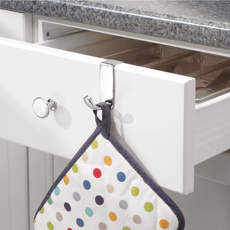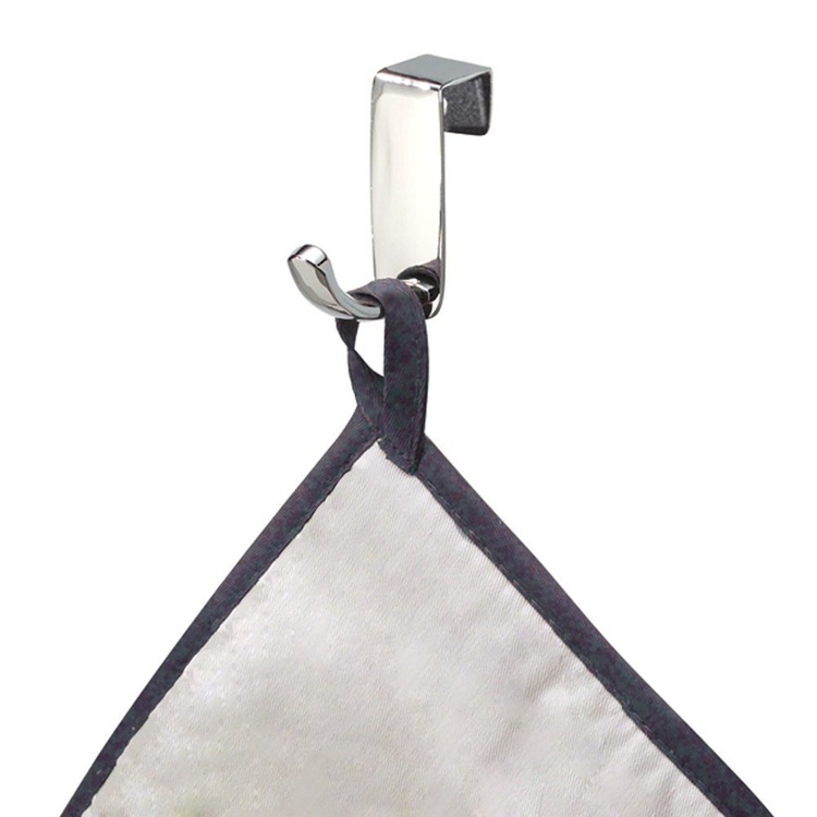 En krok i polerat kromat stål för handduken/grytlappen hänges enkelt över skåpdörren eller lådan. Du slipper fula borrhål och kroken kan lätt flyttas när du vill. Välj själv om kroken ska hängas synlig på utsidan eller dold på insidan av dörren. -