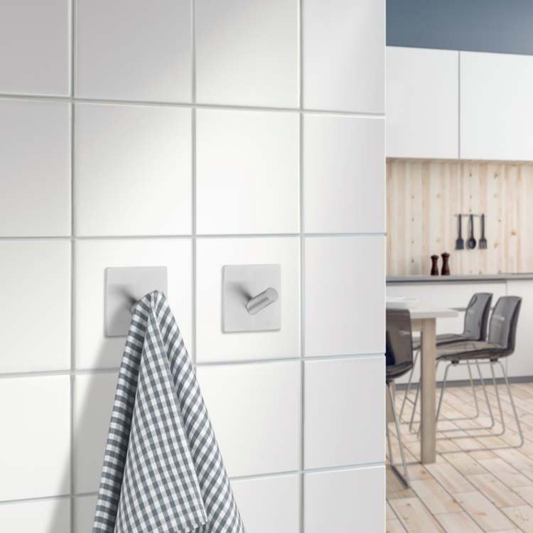 Enkelt och snabbt, sätt upp en krok och få snygg ordning. Med bra självhäftande klister på kroken behövs inga verktyg! -