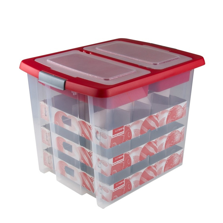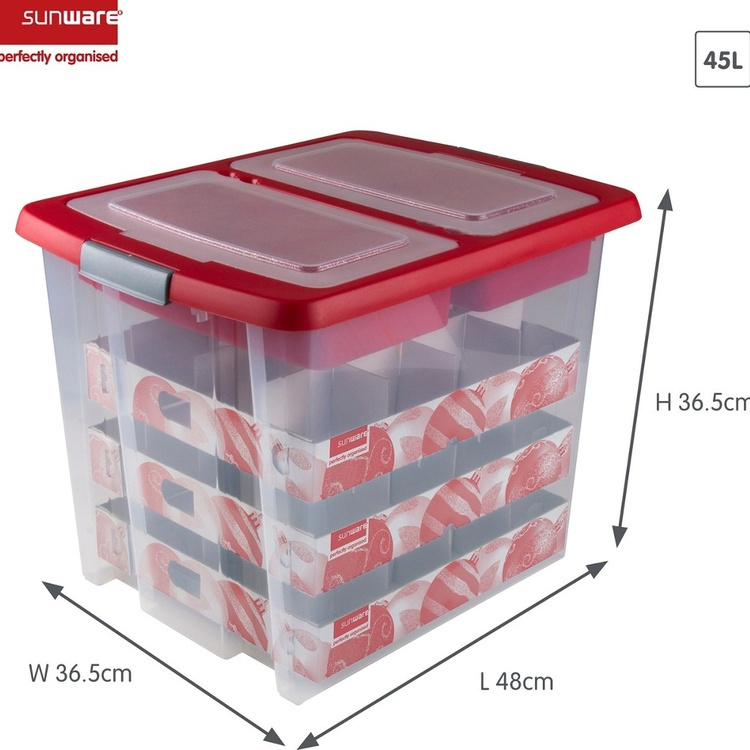 Låda för Julpynt, Fack i locket, 45 Liter, XL GLITTER BOX, 48 x 36,5 x H 36,5 cm, Klar / Röd