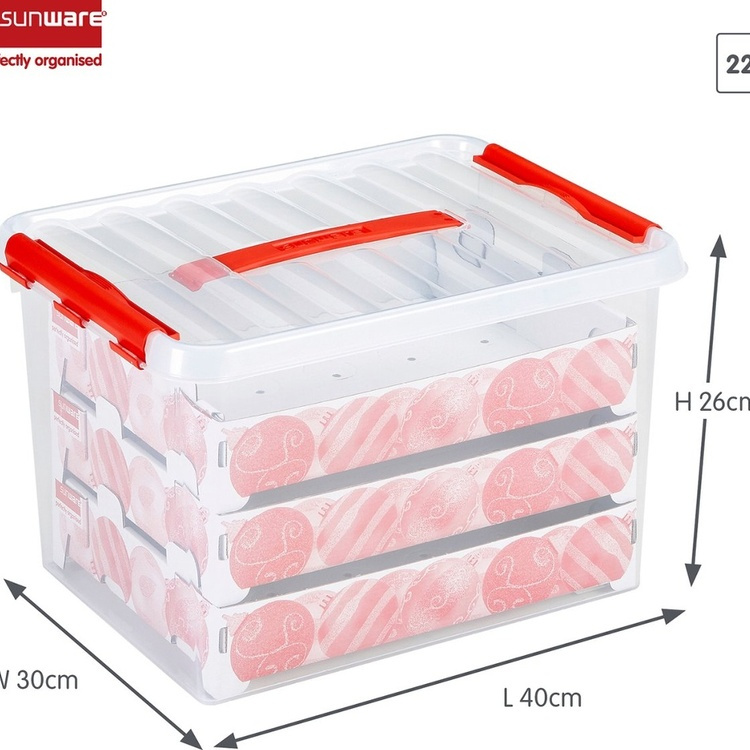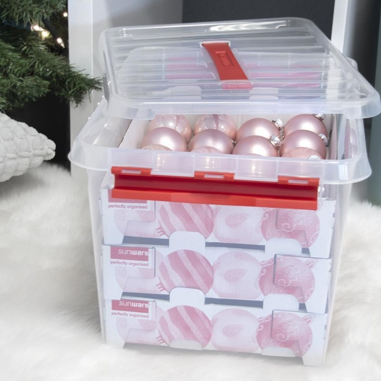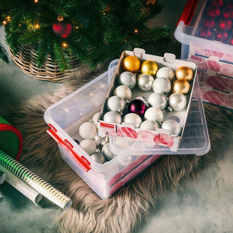 Låda för Julpynt. Med handtag, 22 Liter, CHRISTMAS BOX, 40 x 30 x H 26 cm, Klar / Röd