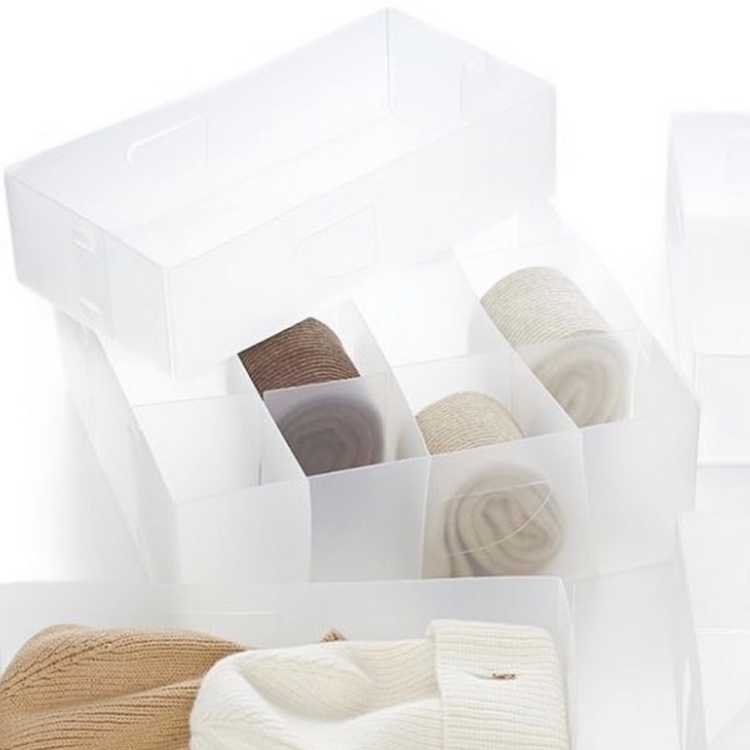Praktisk förvaring som hjälper att hålla ordning i lådan. Hitta lätt dina strumpor, skärp, trosor eller smycken. Med de här boxarna i vitplast får du både snygg ordning och snabb koll på vad du har i lådan. 12 fack.