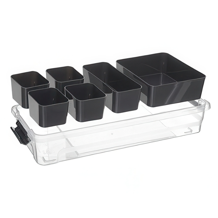 Låda, långsmal, med 6 burkar för sortering, EZY SORT IT, 35 x 15.5 x H 7 cm, Transparent / Grå