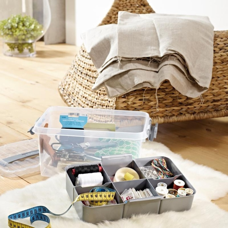 Förvaringslåda med handtag och insats.