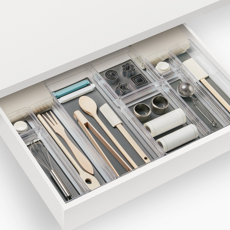 Avlånga lådinsatser / förvaringsbrickor i klar akryl med grå anti slip.