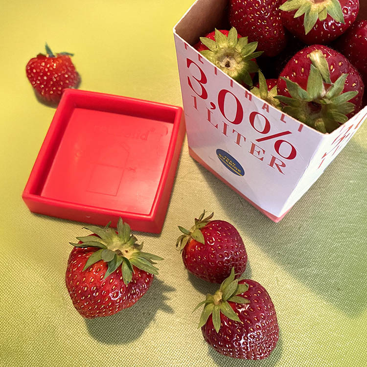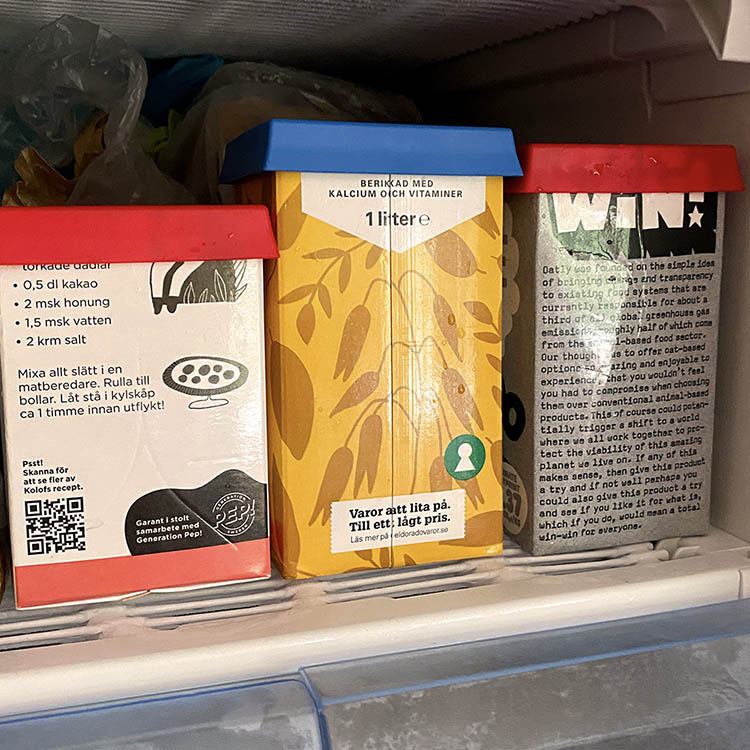 Skölj ur kartongen i varmt vatten med lite diskmedel och låt den rinna av. Öppna sedan toppen så att du får en rak kant och klipp kartongen till den höjd du vill ha. Välj därefter lock: blått lock till kartonger med platt topp och rött lock till kartonger med spetsig topp.För torra varor är det bra att låta kartongen torka helt invändigt innan du fyller den. Vid kylförvaring kan du med fördel märka kartongen med innehåll och datum. När kartongen blivit sliten återvinner du den, behåller locket och använder det på en ny, ren kartong.