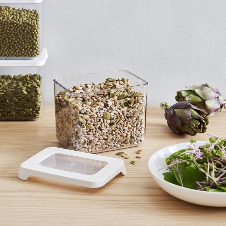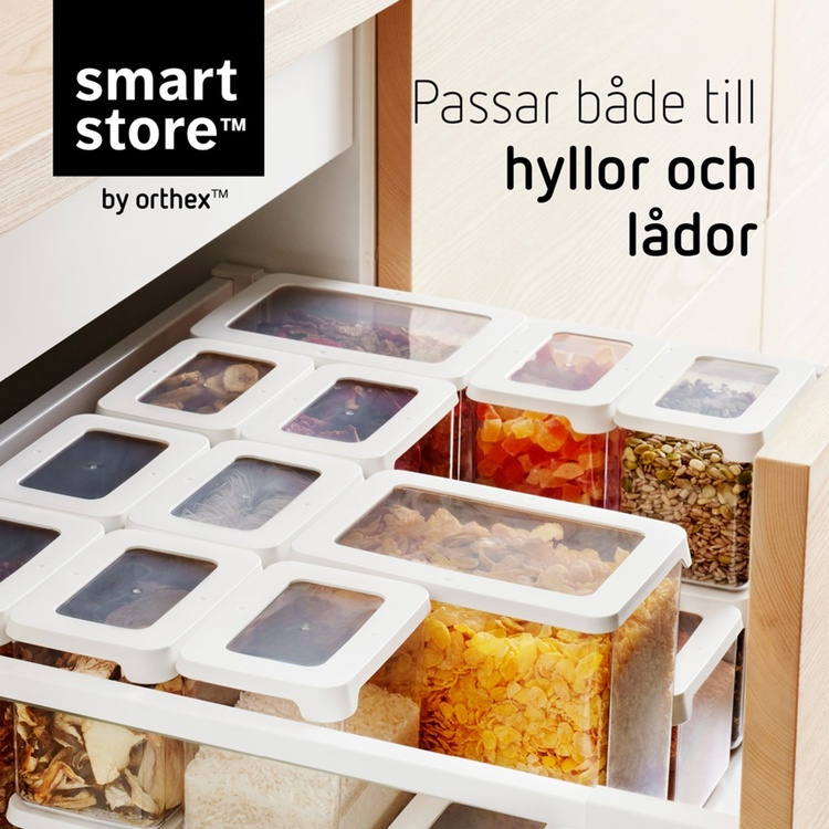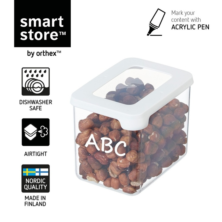 Transparent, stapelbar och lufttät förvaringsburk! Och snygg! Passar utmärkt både till torrförvaring och i kylen. I den här burken kan du förvara t.ex. nötter, pasta, flingor och mjöl.
