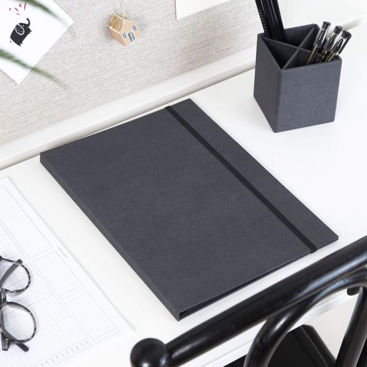 Snygg, enkel mapp med hårda pärmar i A4 storlek från Bigso. Förvara din viktiga papper säkert på ett ställe. Stängs med gummiband. Invändig ficka. -