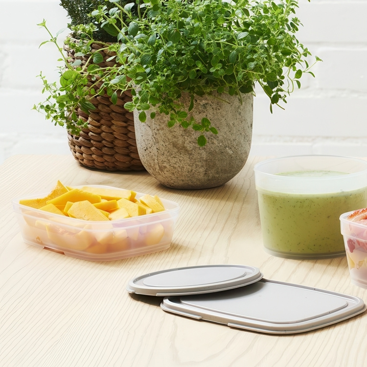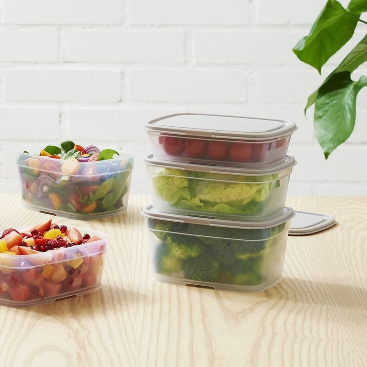 Lufttät behållare som kan staplas i varandra om dom är tomma och på varandra i kylskåpet.