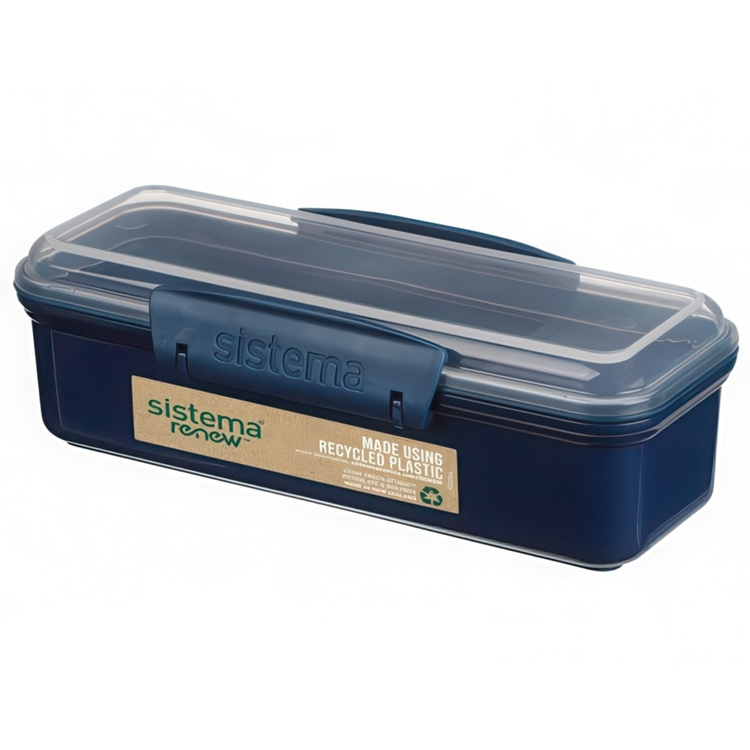 Praktisk avlång, liten, tvådelad matlåda tillverkad av återvunnen giftfri plast.