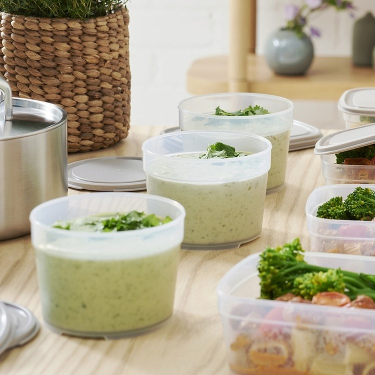 Lufttät behållare som kan staplas i varandra om dom är tomma och på varandra i kylskåpet.